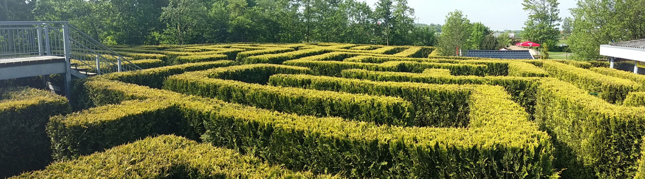 Das Ziel befindet sich bei uns in der Mitte des Irrgartens. Dort können Sie auf die Aussichtsbrücke steigen, von der Sie einen wunderbaren Überblick über den Irrgarten und das umliegende Gelände haben. Und es soll auch glatt Menschen geben, die sich einen Spaß daraus machen, den nachfolgenden „Irrgängern“ von der Brücke aus falsche Tipps zu geben!