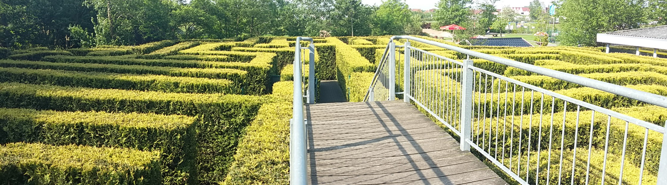 Über die Aussichtsbrücke können Sie zügig das Drehkreuz am Ausgang des Irrgartens neben der Kerzen-Kreativwerkstatt erreichen. Bei Lust und Laune können Sie alternativ die Strecke in umgekehrter Richtung abgehen und den Irrgarten durch das Eingangstor verlassen.